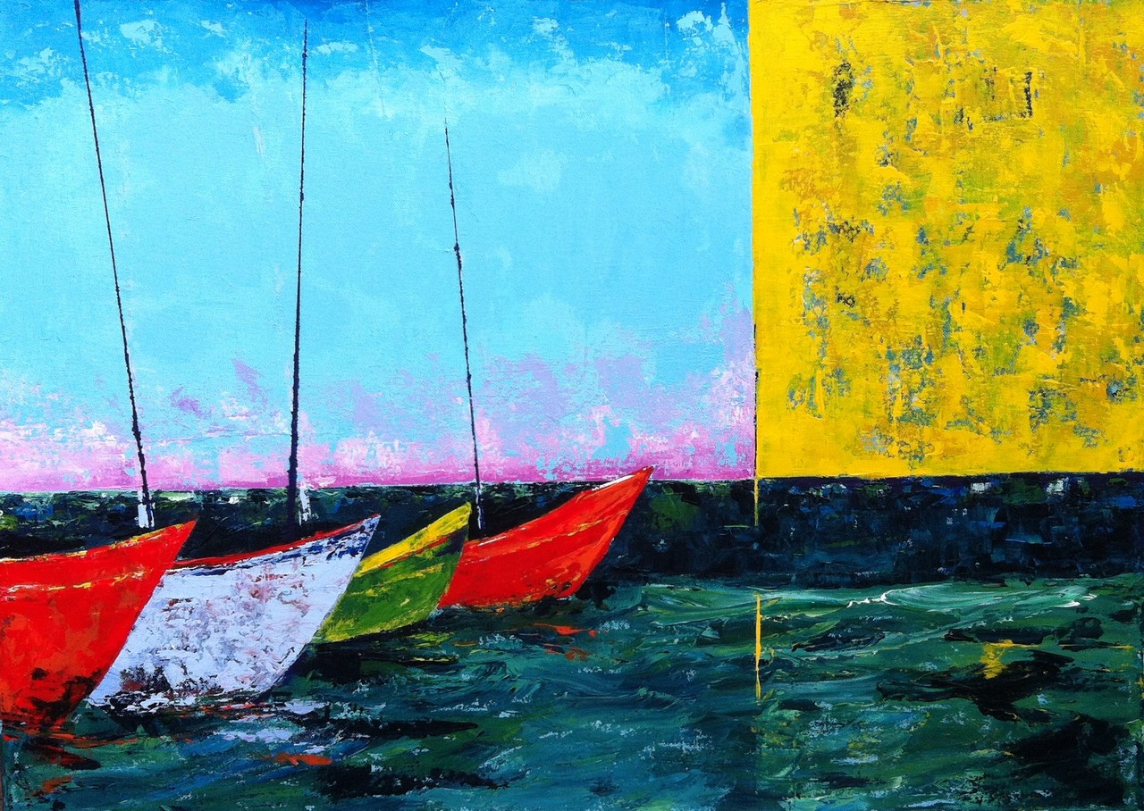 Schilderen met acryl en paletmes. Meeste schilderijen ontstaan vanuit innerlijk beeld, indruk of tekst.