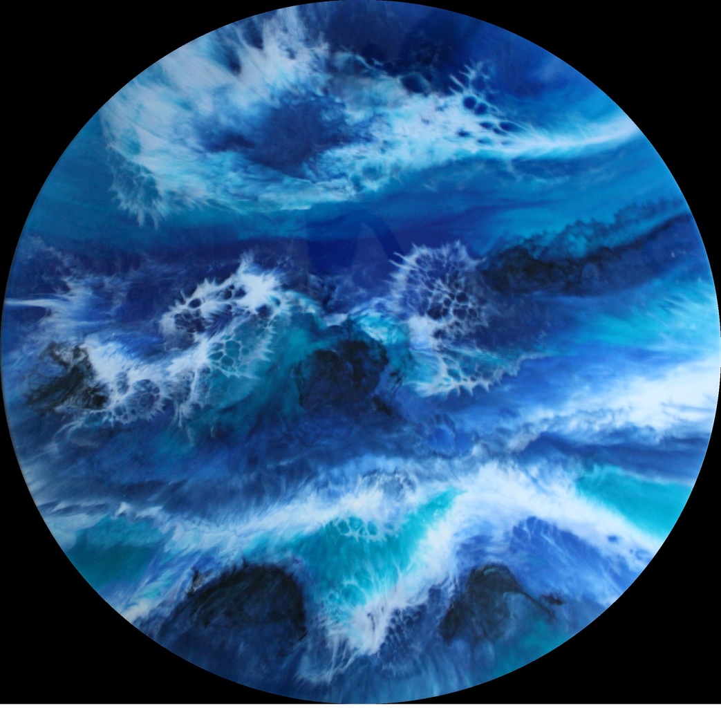 Oceans, de wereld vanuit de ruimte. Epoxyhars gekleurd met pigementen op MDF. Rond 90cm doorsnede. Door de epoxyhars heeft dit werk erg veel diepte en glans.