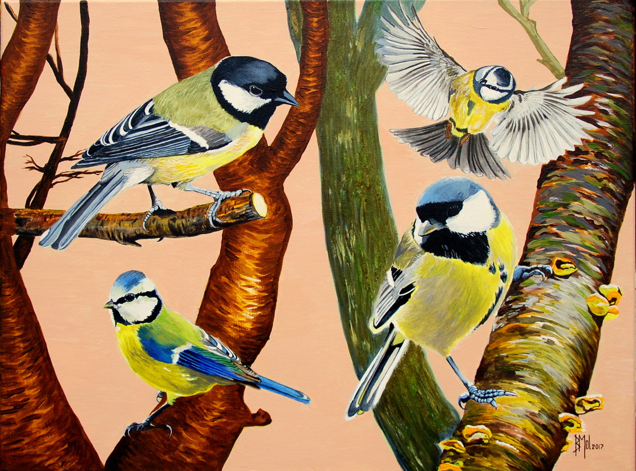 Koolmezen en pimpelmezen , 60x80 acryl op doek. 2017