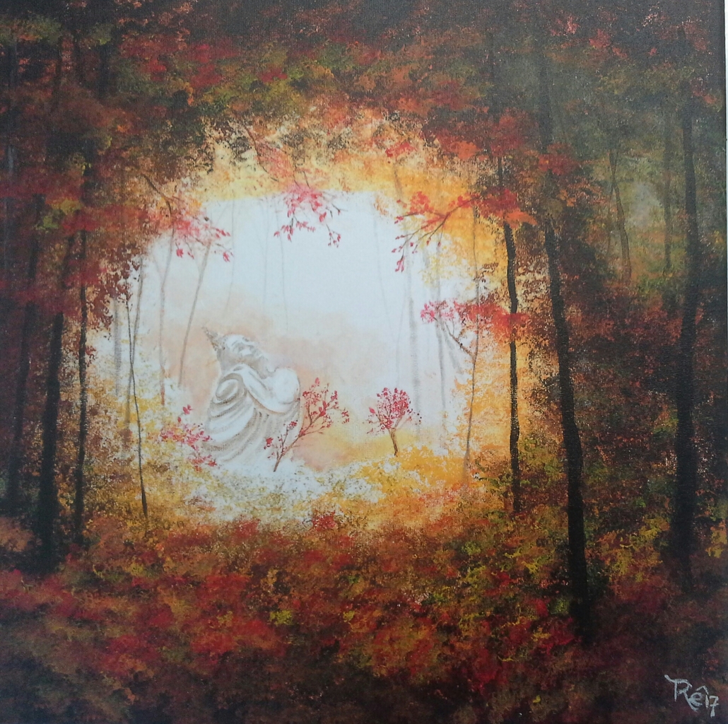 Boeddha Boeddhisme Acryl Acrylverf Verf Doek Oerwoud Zonsopgang Nevel Mist Boeddhabeeld Beeld