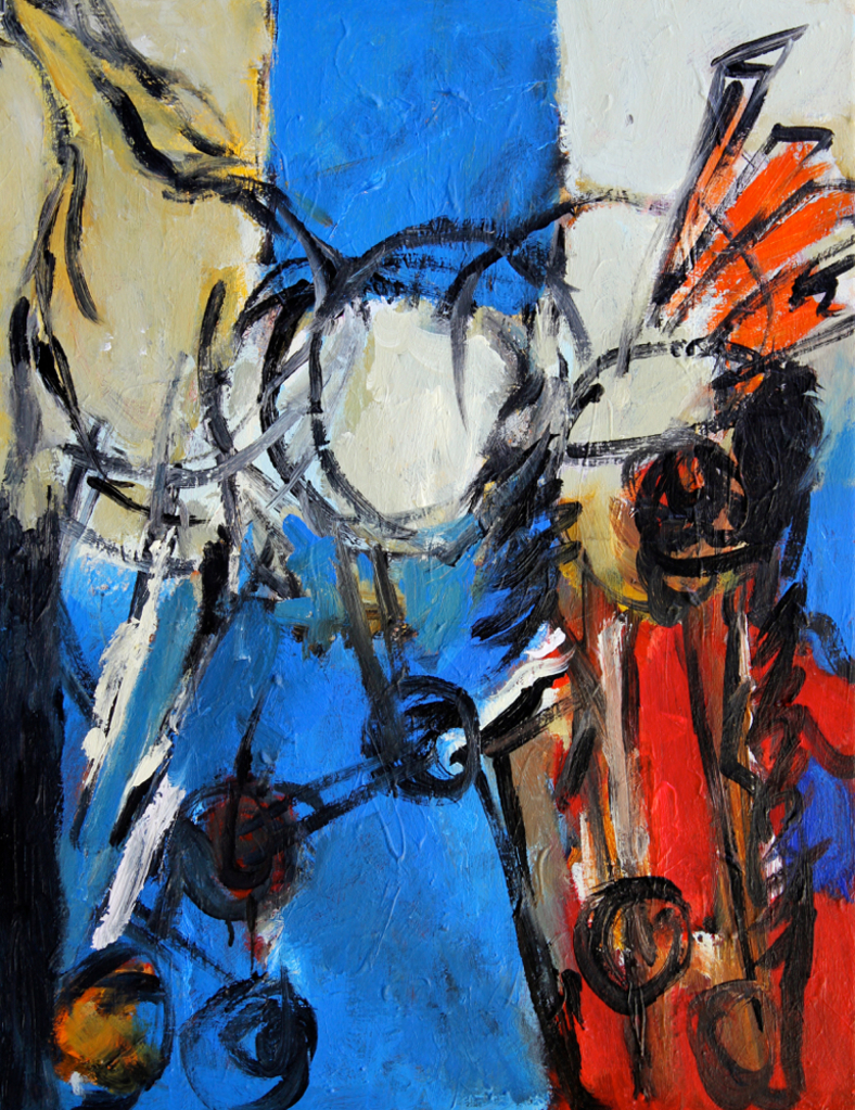 Mijn schilderijen komen tot stand door uit te gaan van een bepaald idee, of een bepaald beeld dat ik voor ogen heb. Soms ga ik alleen uit van bepaalde vormen en kleuren.