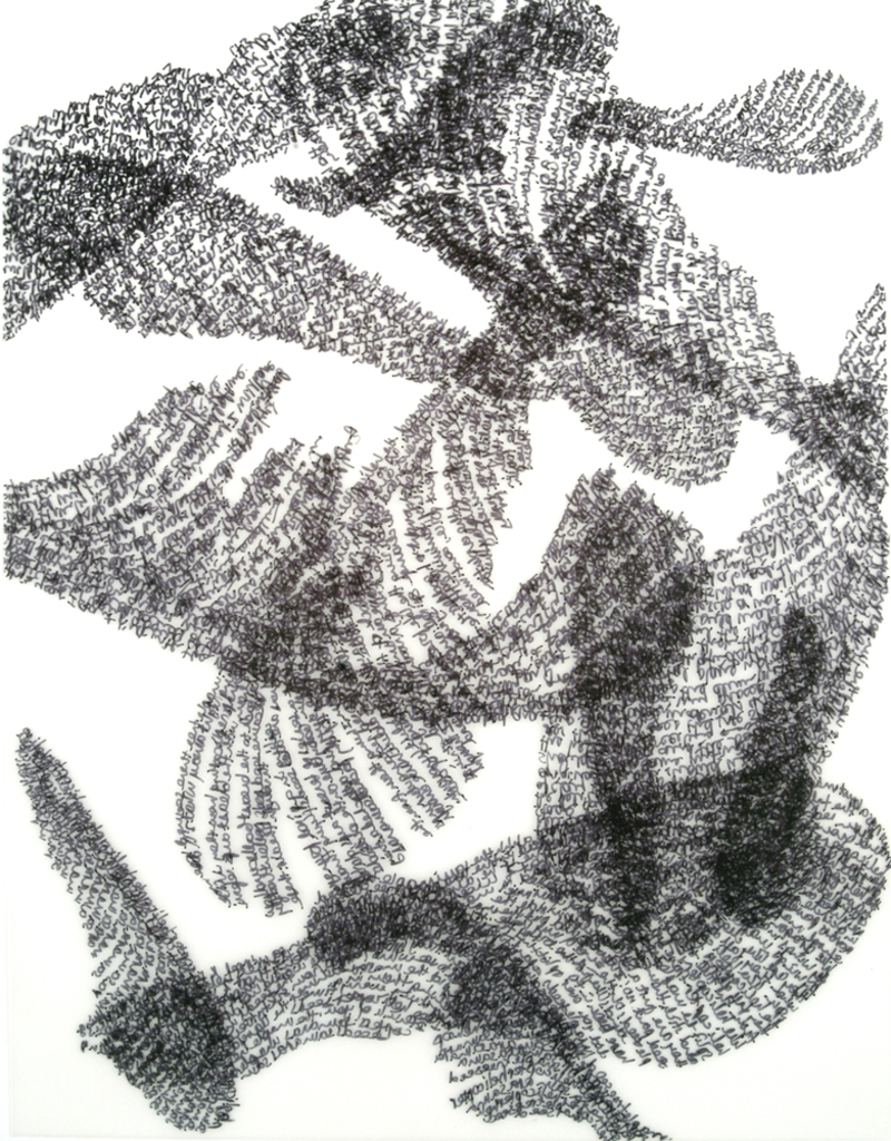 De lijnen van deze dwarrelende zaaddozen in 'samaras: tumbling' worden gevormd door regels van teksten over helicoptertjes.