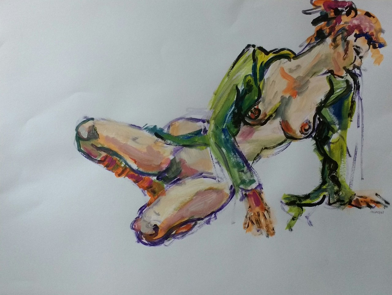 Naakte vrouw met groen vest en gekleurde kous, geschilderd in acrylverf op papier 65x50 cm.