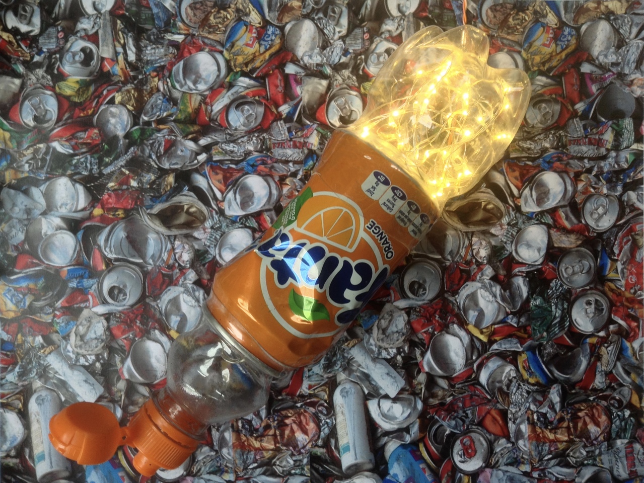 Kunst van rommel Een foto van een oude PET-fles met daarin een leeg limonadeblikje ( nu beide eindelijk met statiegeld ).