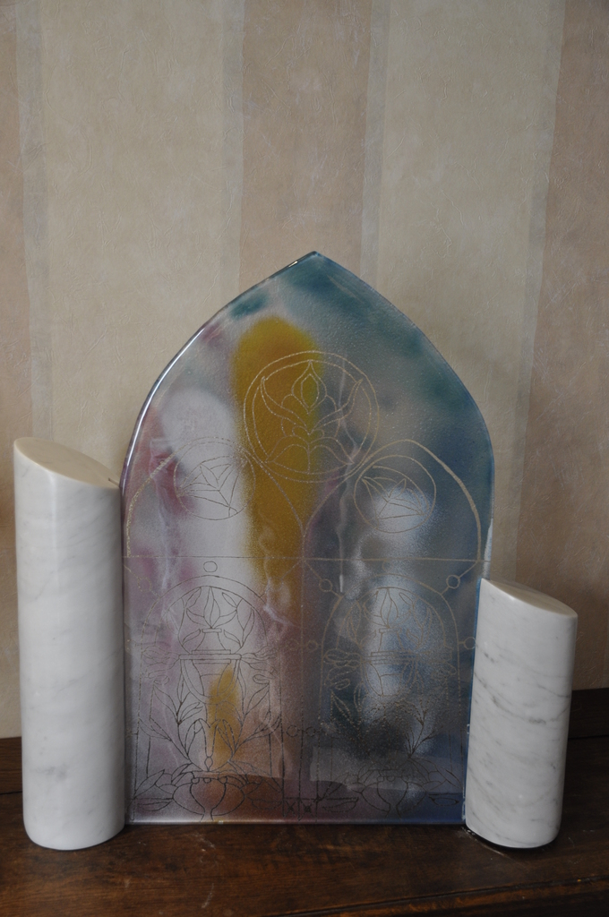 object van glas, "gevangen" in marmeren zuiltjes