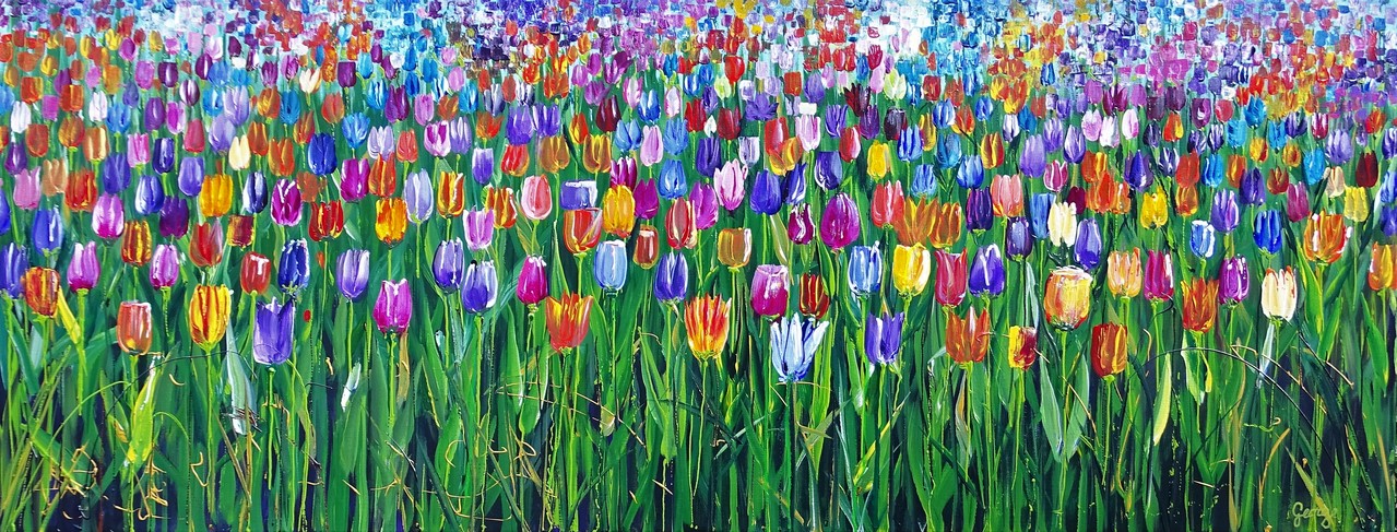 Bont gekleurd tulpenveld For sale at: https://www.kunsthandeldekker.nl/agenda