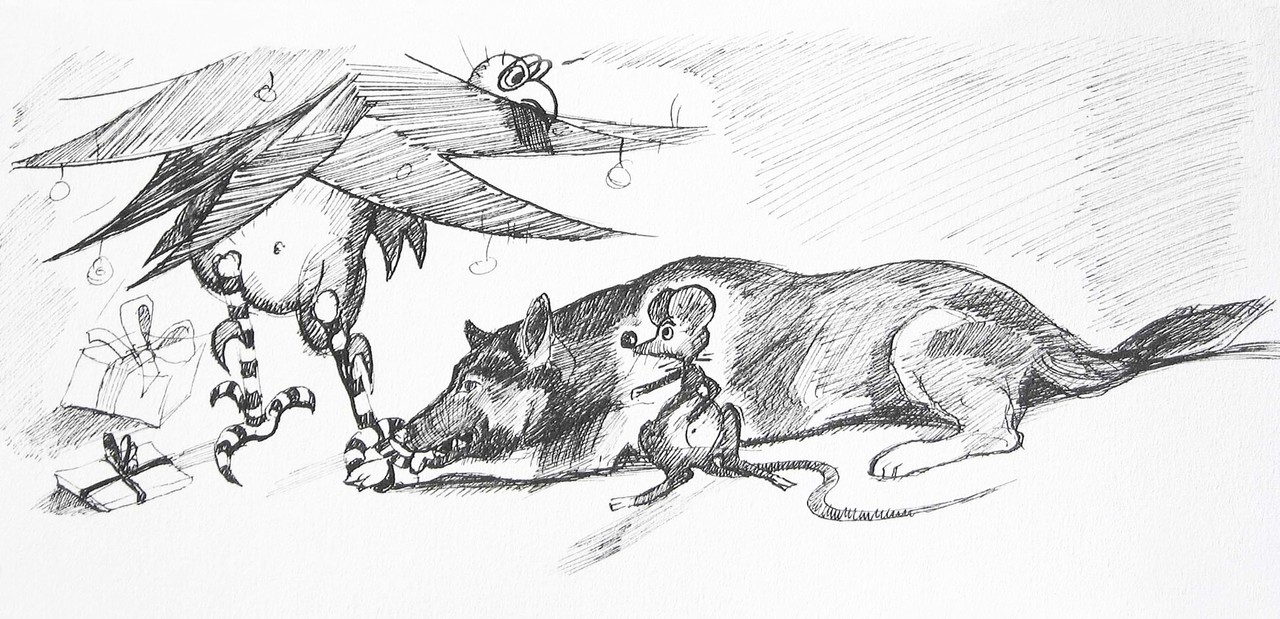 Wolf vindt een bot onder de kerstboom en denkt dat 't zijn cadeautje is, maar het is de poot van Kale Koen.