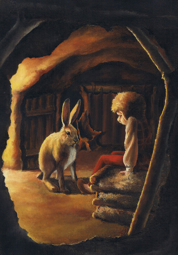 Een illustratie uit mjn boek Framgord de dwerg. Hij heeft juist zijn vriend Haas verteld dat hij op een zoektocht zal moeten gaan om de Parel van de Vrijheid te vinden.