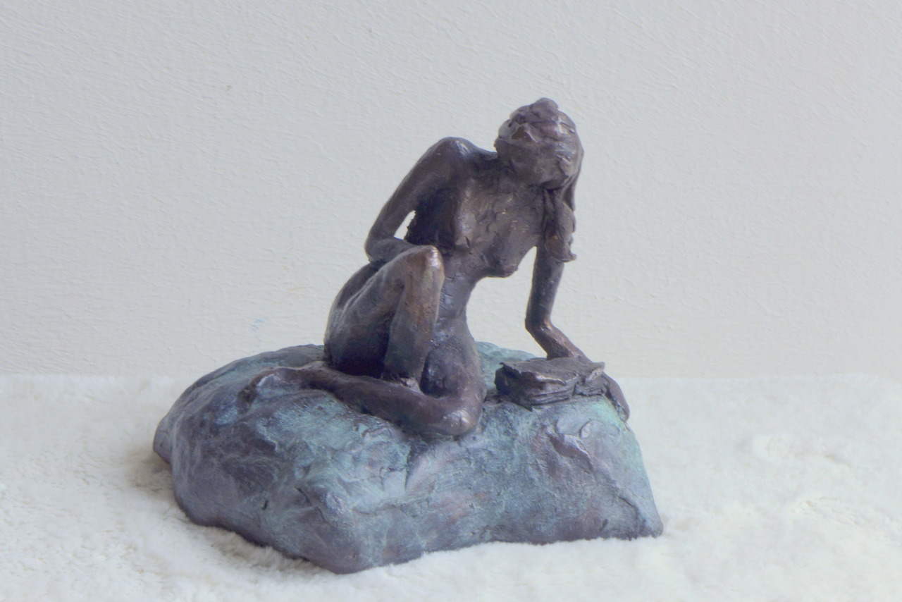 Lezende vrouw zittend op kussen unicum met groenpatina. Verkocht