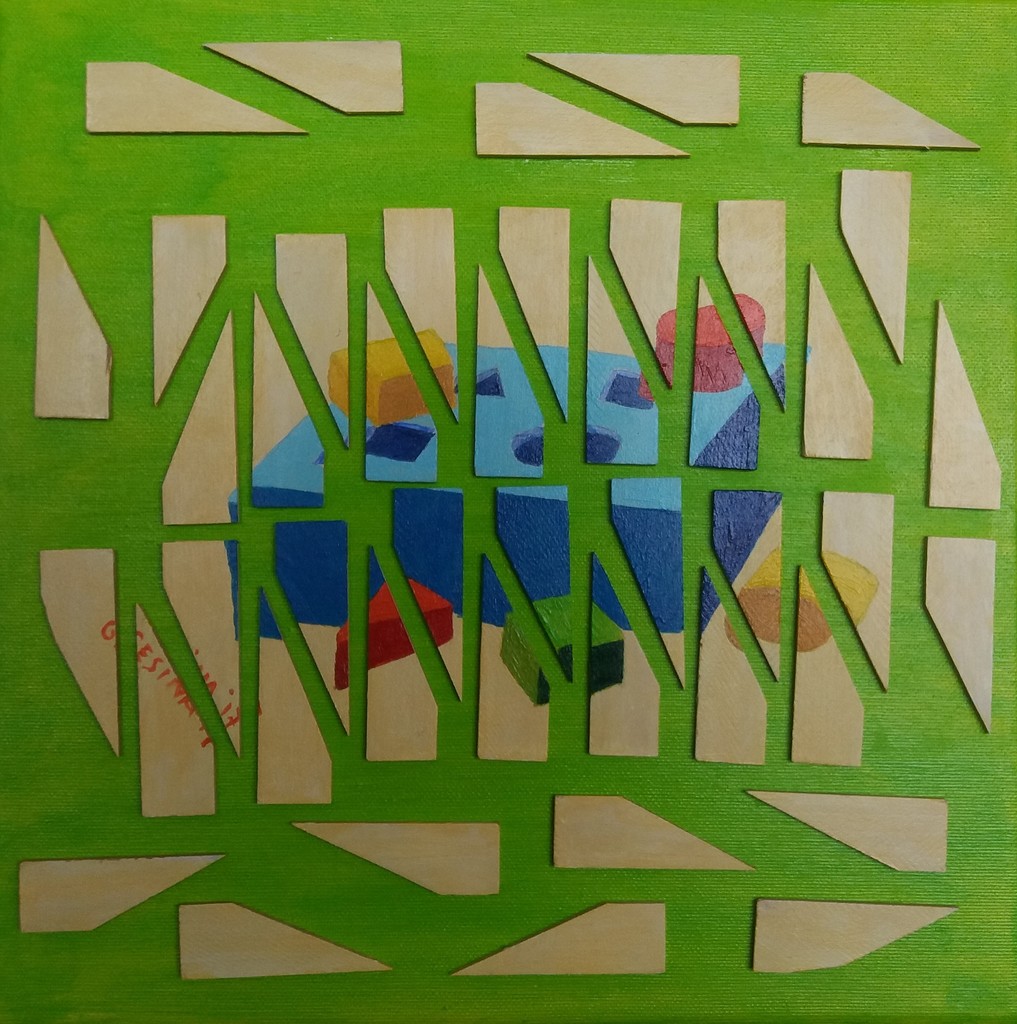 Puzzel geschilderd op spanhoutjes bevestigd op doek.