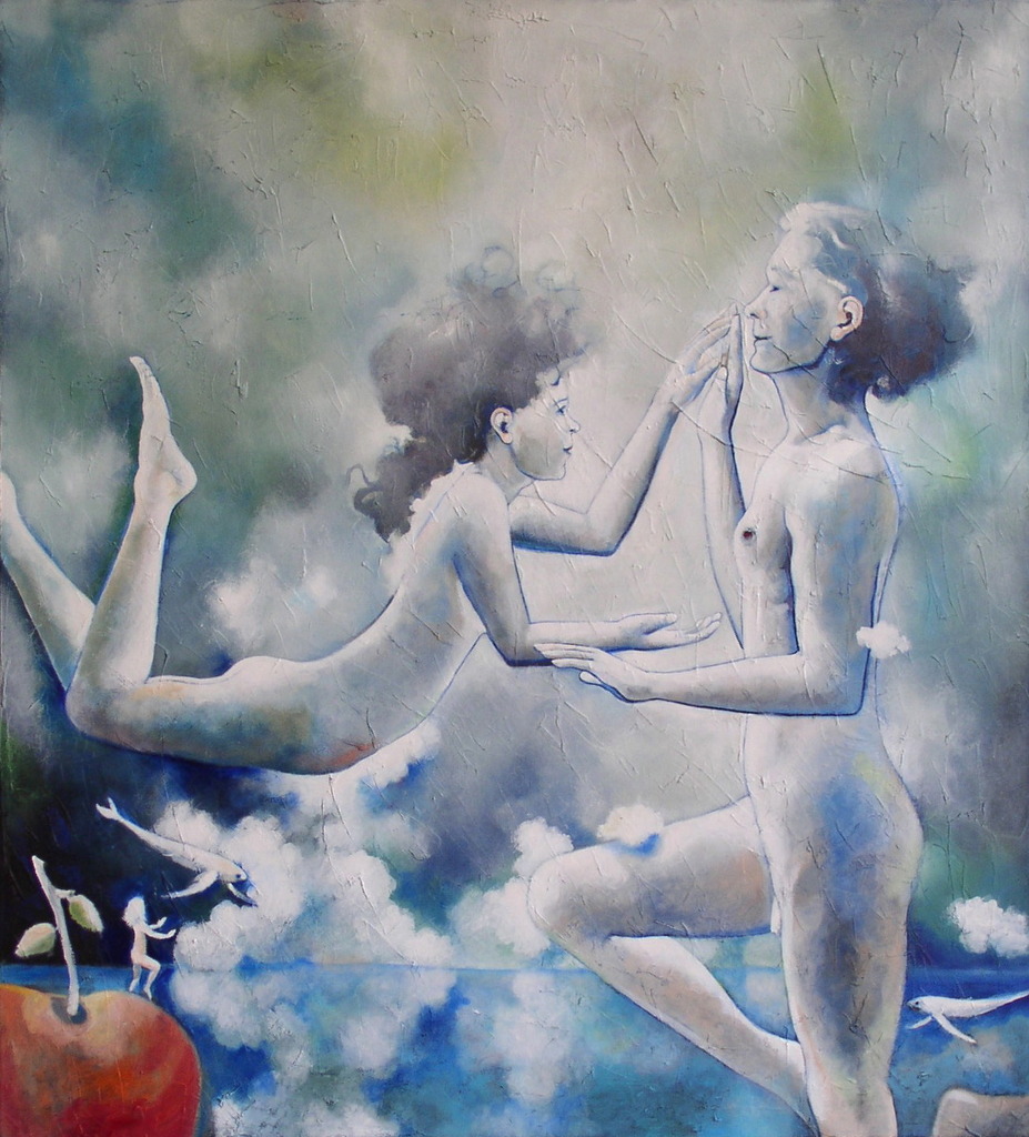 Wit Landschap Blauw Spiritueel Vrouw Man Water Vis Appel Blad Vliegende