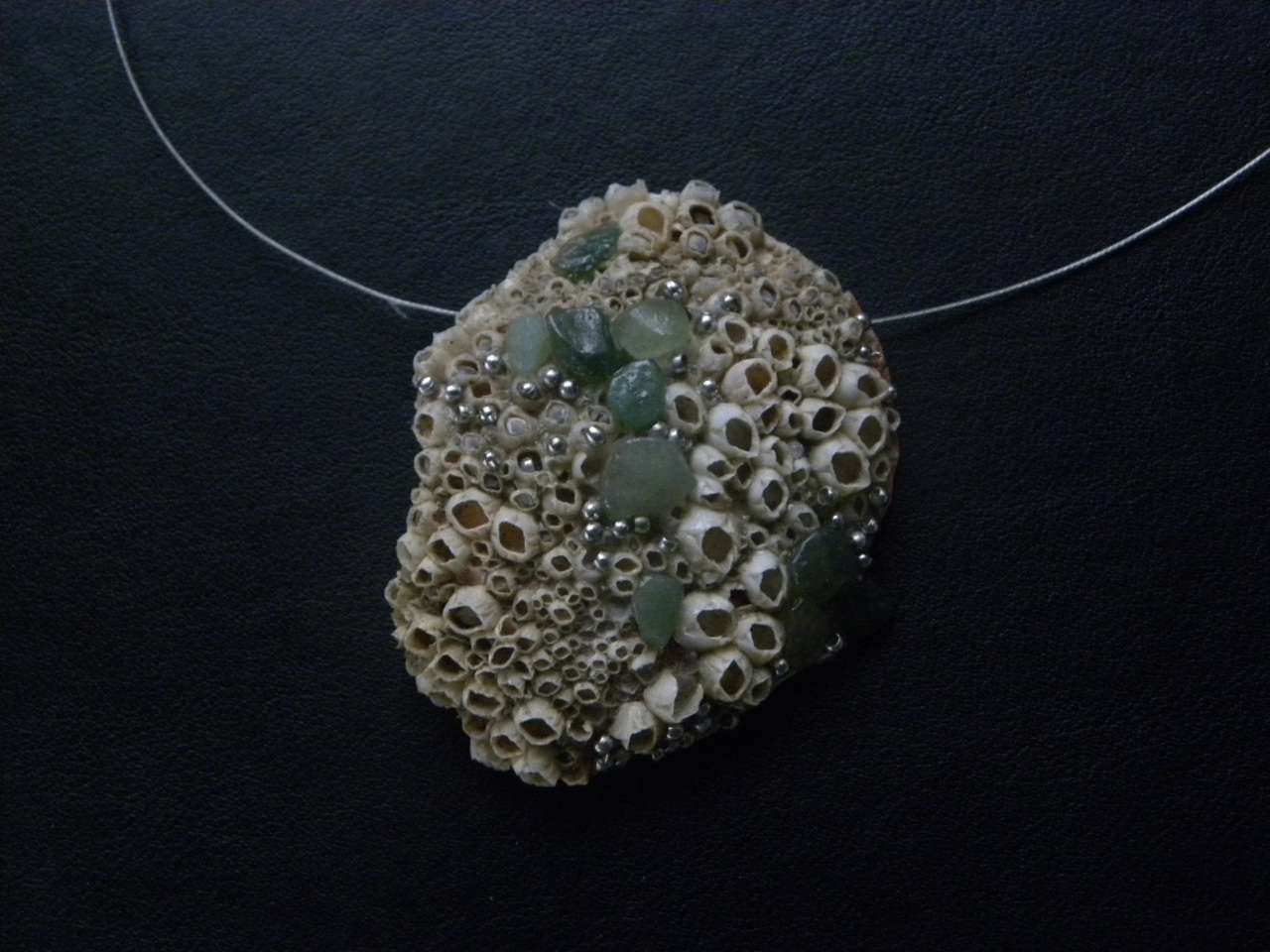 In Rockanje zoeken we graag naar krabbenschilden met zeepokken. Slecht een heel klein deel is bruikbaar. Hier waren we erg blij mee. Door de combinatie van groene steentjes, zilverkleurige kraaltjes en de zeepokken lijkt het geheel te borrelen zoals je dat soms ook ziet op de scheiding tussen zee en strand.