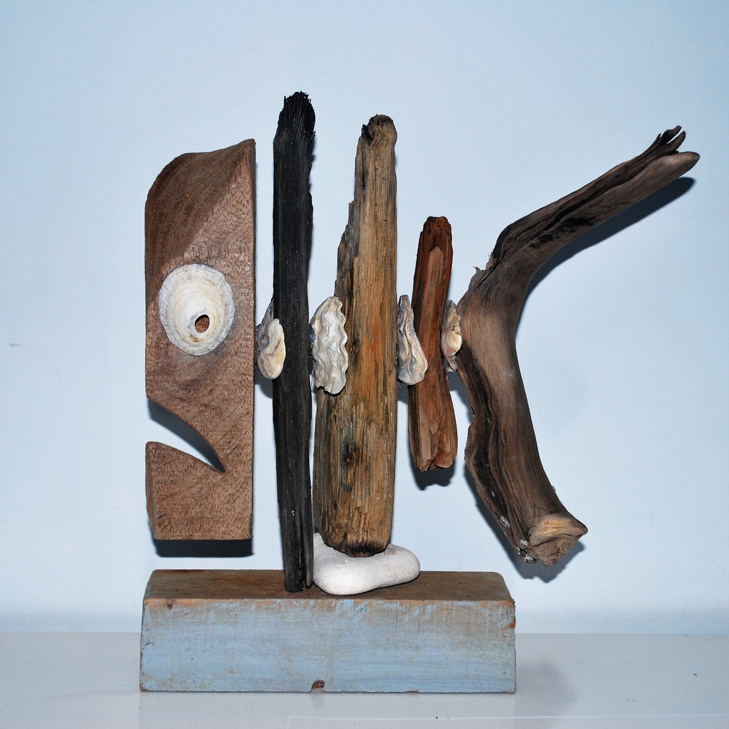 maakt al jaren houten beelden door natuurlijke objecten uit zee te koppelen. De beelden zijn ruw en puur.