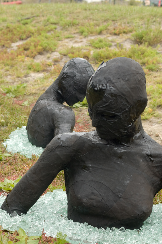 De geboorte bestaat uit menselijke figuren die vanuit het donker naar het licht toe komen. Het licht wordt gevangen door het glas waar zij doorheen breken. Werk is gemaakt van leer en glas.