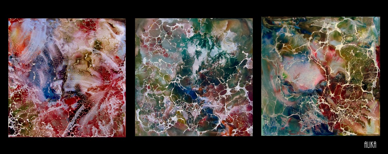 Kleurrijk encasutic art op 3 paneeltjes in een zwarte baklijst