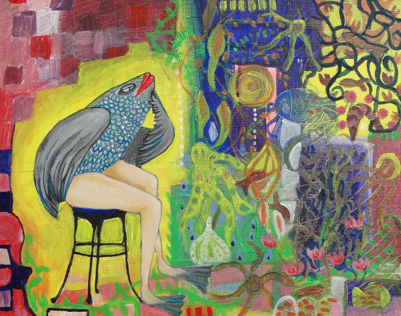 Vis op kruk in een abstract "landschap".Kleurrijk werk waar je naar blijft kijken. Vis heeft vrouwenbenen en vogelvleugels. Is het wel een vis en waar kijkt ze naar?