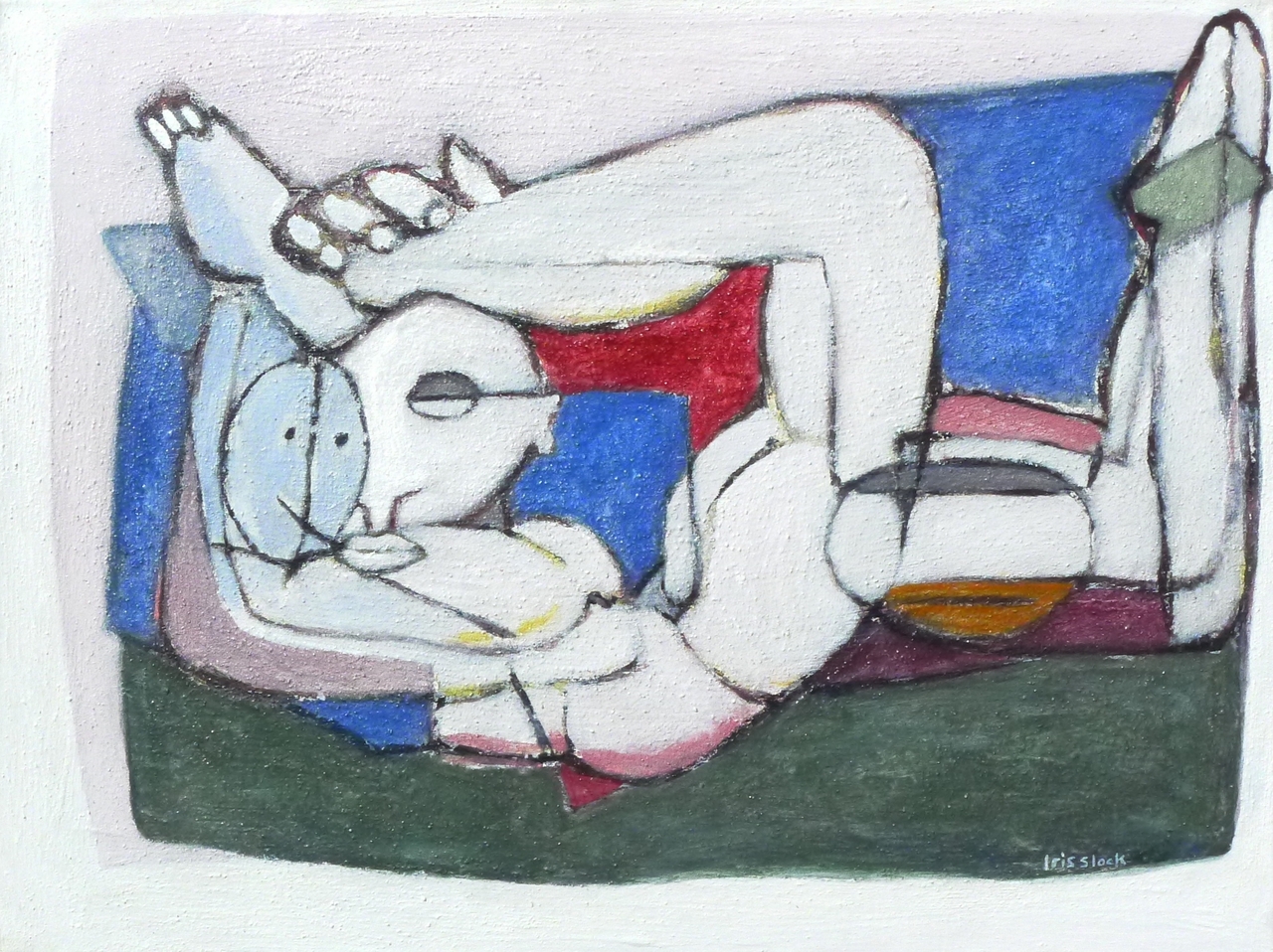 Een zwevend figuur figuur met voor haar hoofd nog een gezicht (haar kindje in haar dromen is bij haar) en in haar bovenbeen zou je nóg een hoofd kunnen zien (de papa?) . Ze zweeft van geluk.