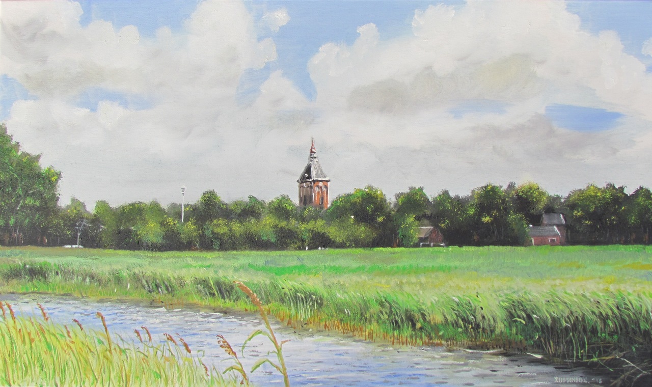 Landschap Groningen Middelstum Figuratief Water Riet Bomen Toren Weiland Groen Blauw Wit Wolk Wolken Gras