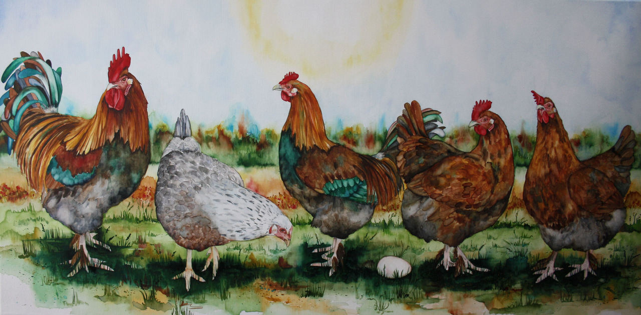 Look what happened. Kippenschilderij in opdracht en naar eigen wens van de klant. Aquarel door een speciale techniek op doek geschilderd.