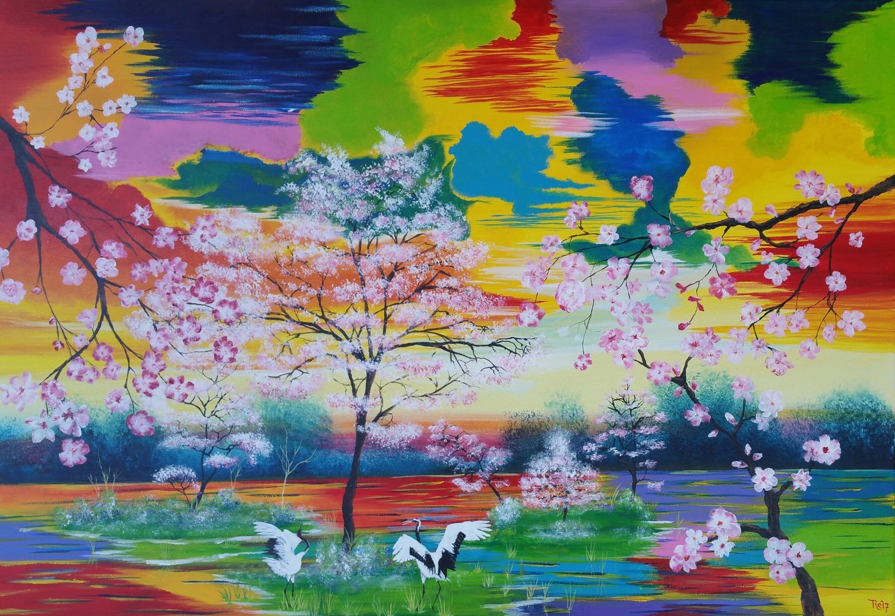 Kleurrijke lucht weerspiegelend in het water op wat kleine eilandjes bloesembomen, kraanvogels en zo voor je ogen takken met bloesen.