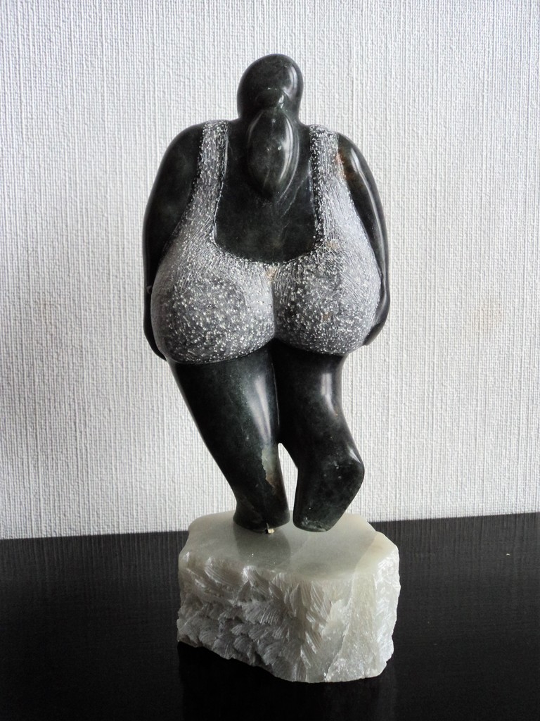 Deze dikke dame is gemaakt van speksteen. Ook de sokkel is een ruw stuk speksteen. verkocht.