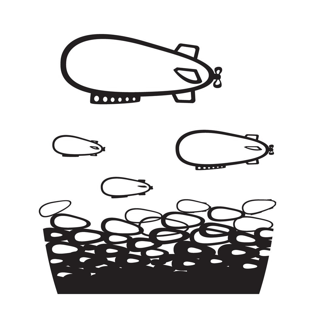Een serie tekeningen met variaties op het thema zeppelin en onderzeeer.