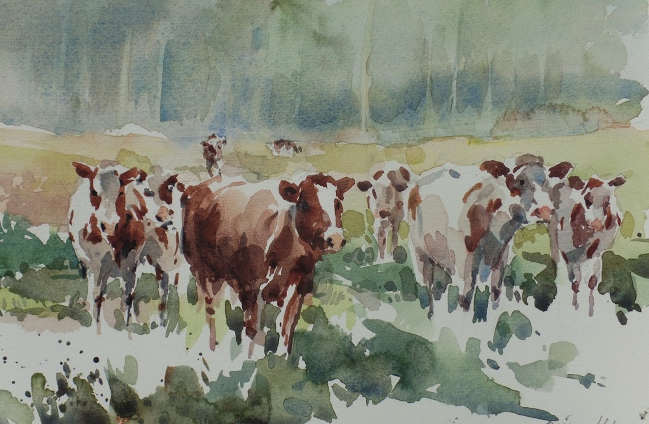 Aquarel Koeien Brabant Ochtendlicht