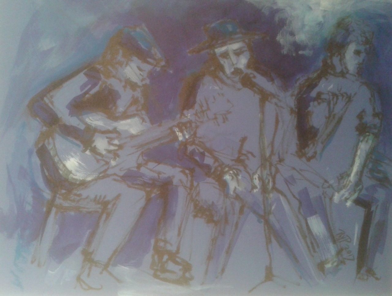 Live optreden band Blue Moray ( bluesband) Inkt op koningsblauw pastelpapier. Live