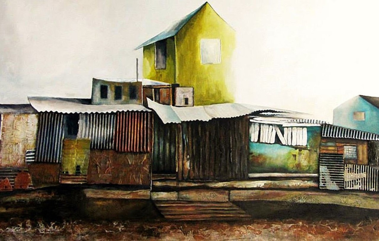 Schilderij Abstract Afrika Art Media 3d Kleurrijk Vrolijk Kleur Stadsgezicht Sloppenwijk Slum Mixed Stad Straat Kunst
