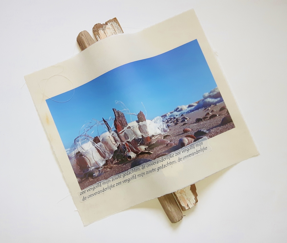 roest en visdraad gevonden aan de kust. Vervolgens geassembleerd en teruggebracht en gefotografeerd aan de kust. Afgedrukt op uitgezeild zeil