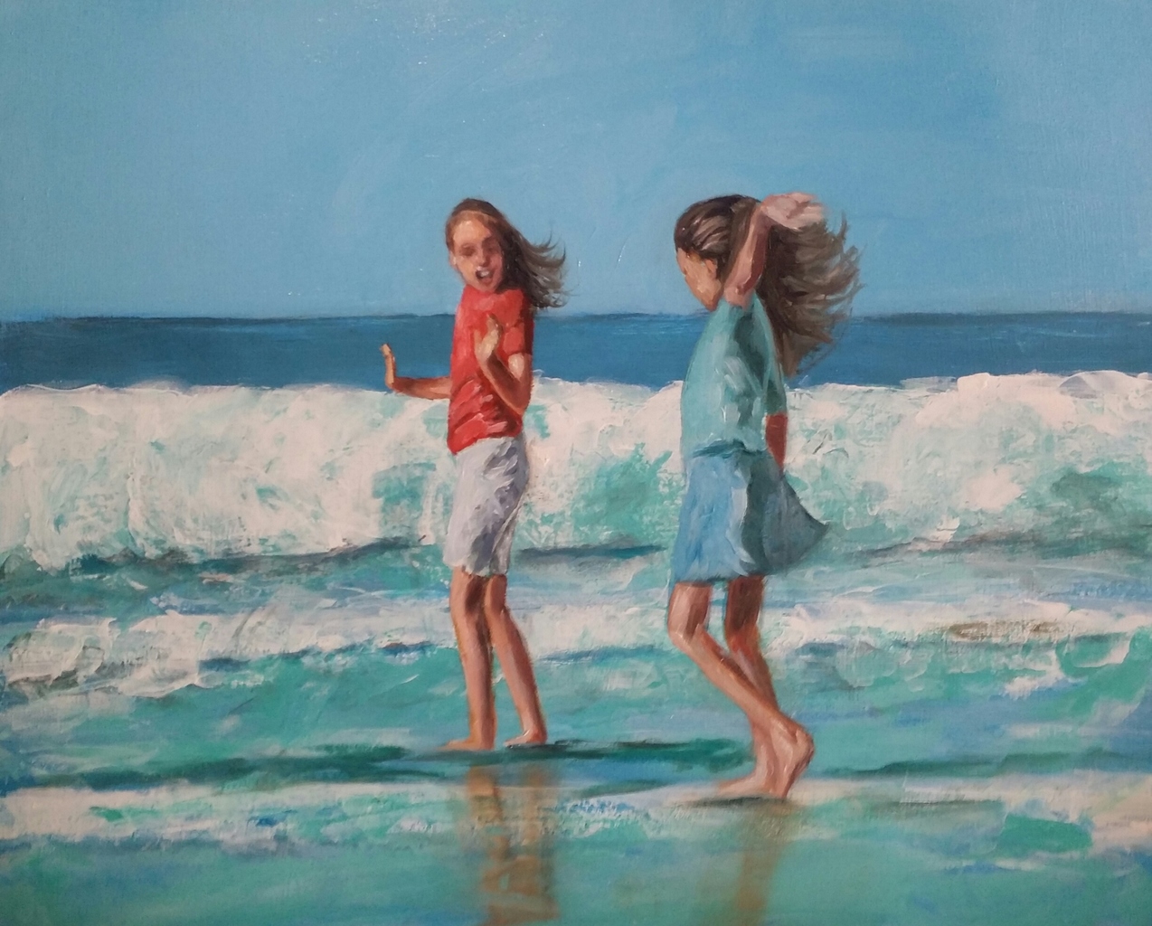 2 meisjes aan zee olieverf op paneel 40-50 cm ingelijst.
