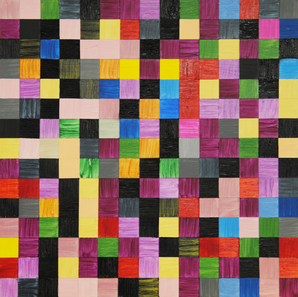 Thema: Chaos (Geometrische Chaos) Mijn kunst is beïnvloedt door de moderne wiskundige en wetenschappelijke benadering van het begrip complexe orde van de natuur. Met name heb ik me verdiept in de Chaos theorie en de fractal geometrie. Ik ben geen wiskundige, en ik gebruik geen wiskundige formules. De ideeën van de Chaos theorie en fractal geometrie leiden tot de ontwikkeling van de composities in mijn werk. Ik gebruik driehoeken,vierkanten en cirkels in mijn schilderijen, maar in mijn huidige serie, geoChao richt ik me alleen op de vierkanten en de verhoudingen tussen de vierkanten. Ik ontwikkel mijn composities door kleine vierkantjes op grote te zetten of grote op kleine te zetten. Het gaat om de onderlinge verhoudingen tussen de vierkanten. Ik laat de methode die ik kies de compositi
