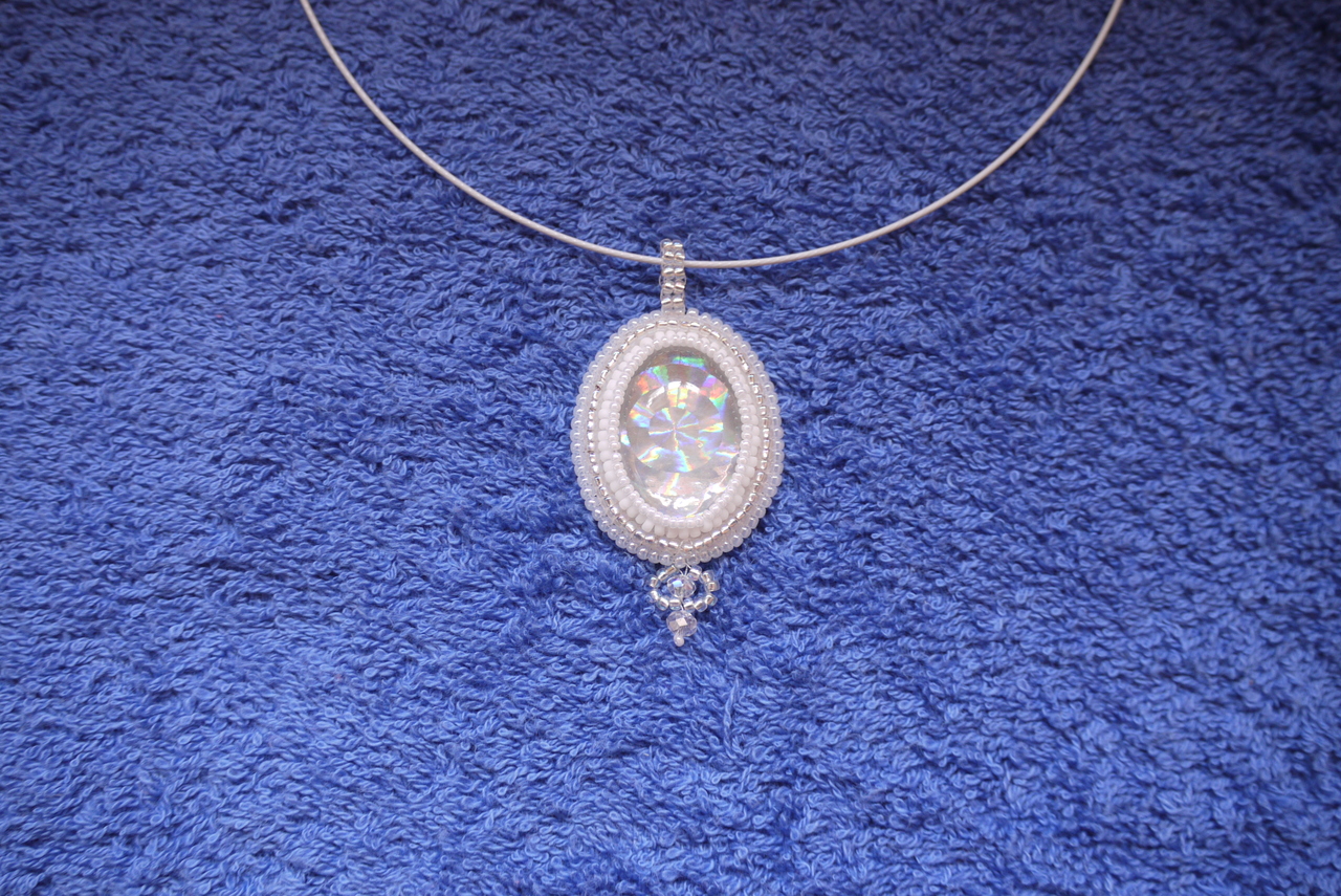 Wit/ zilverkleurige hanger met glazen cabochon met holografische print (aan witte spang)
