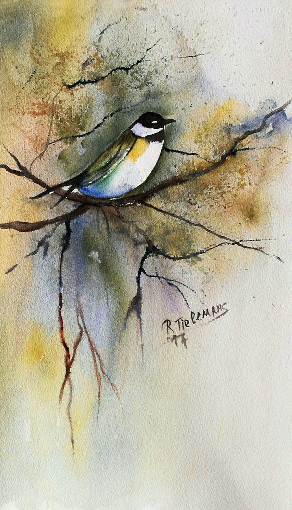 Wit Geel Zwart Blauw Vogel Yellow Bruin Blue Aquarel Black White Brown Bird Watercolour Titmouse Mees