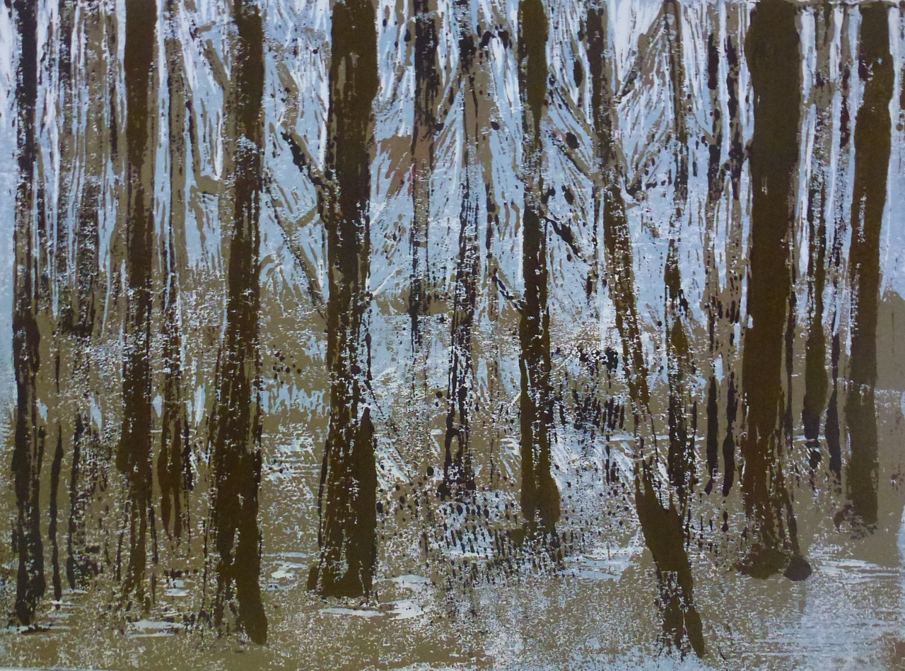 linosnede van bos in 3 kleuren