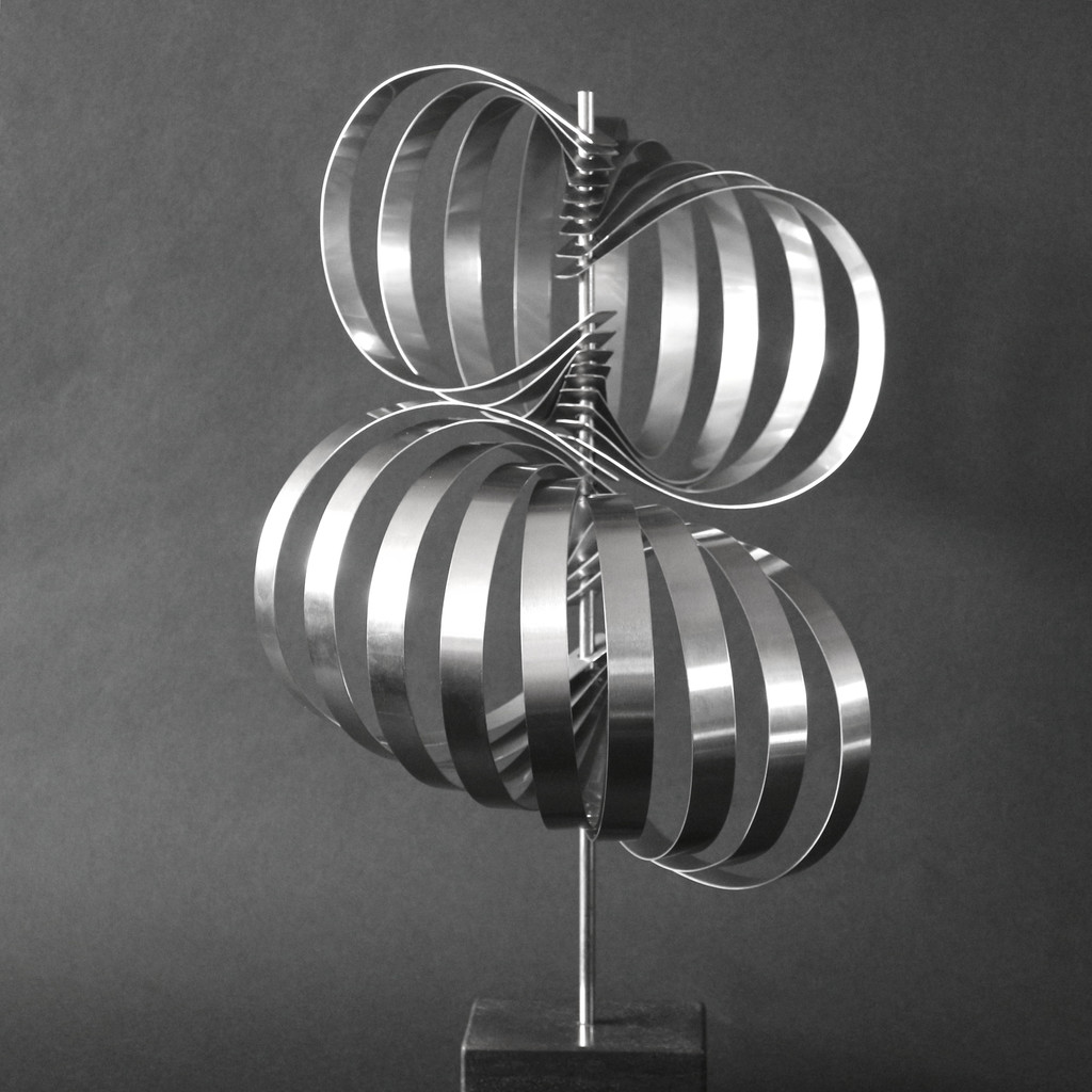Het kunstwerk is opgebouwd met behulp van RVS strips. Door de "spanningstechniek" klemmen de strips aan de RVS stang. De stang staat in een hardstenen sokkel.