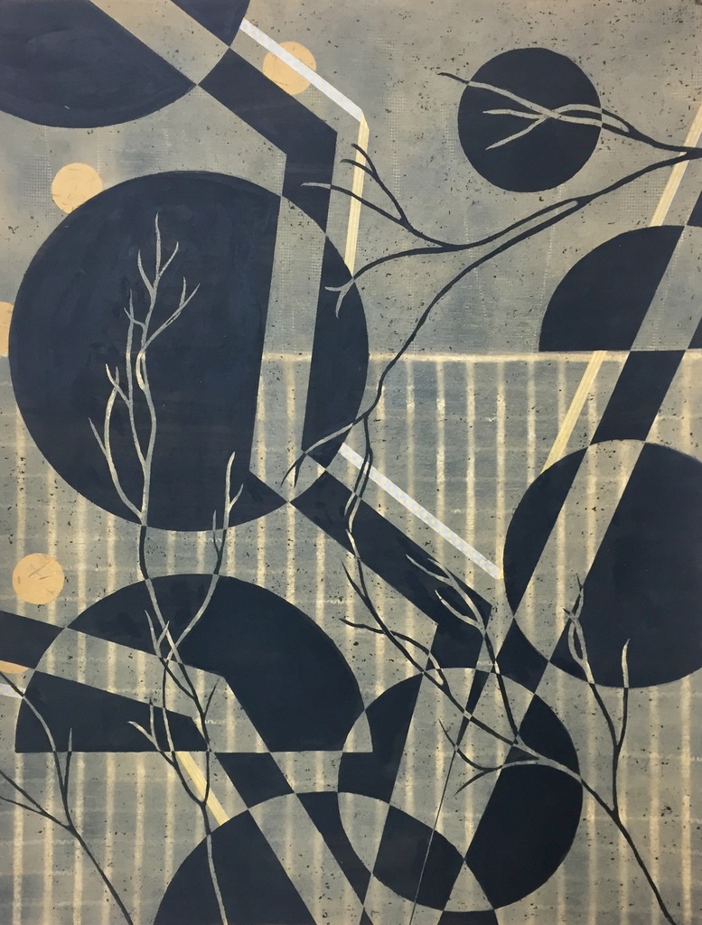 spuitverf, papier, tape, acryl, oliepastel