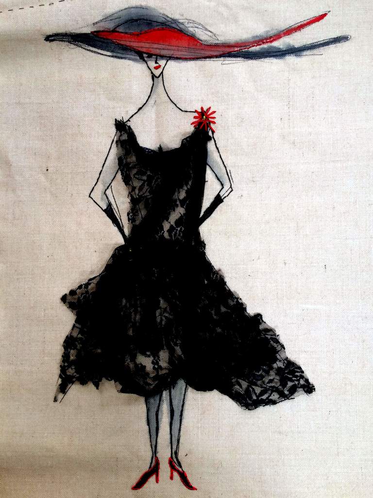 impressie van een vrouw met grote rode hoed en zwarte jurk op de achterkant van geprepareerd schildersdoek, uitgevoerd met appliqué, borduurwerk en aquarelverf
