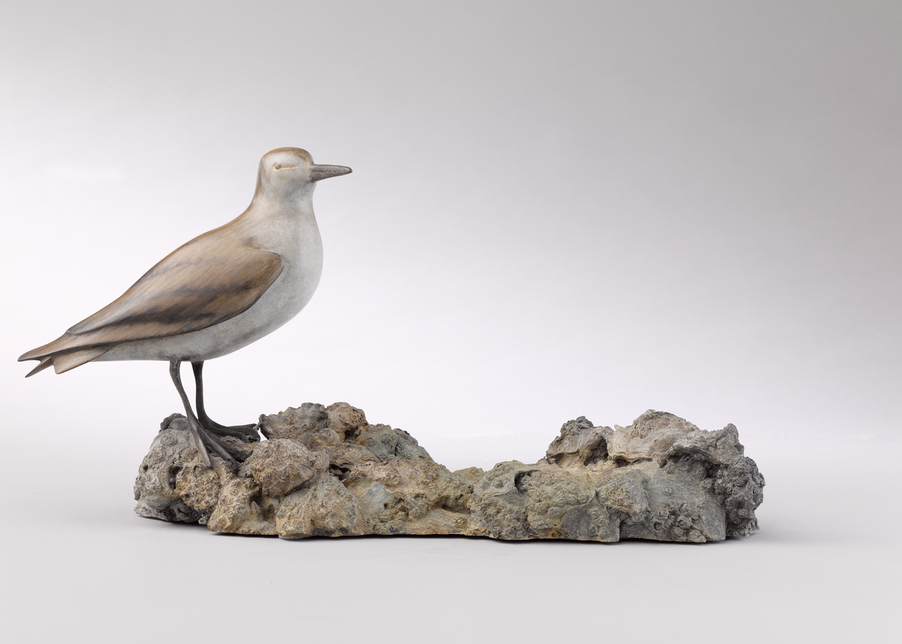 brons gepatineerde strandloper op bronzen oesterbank