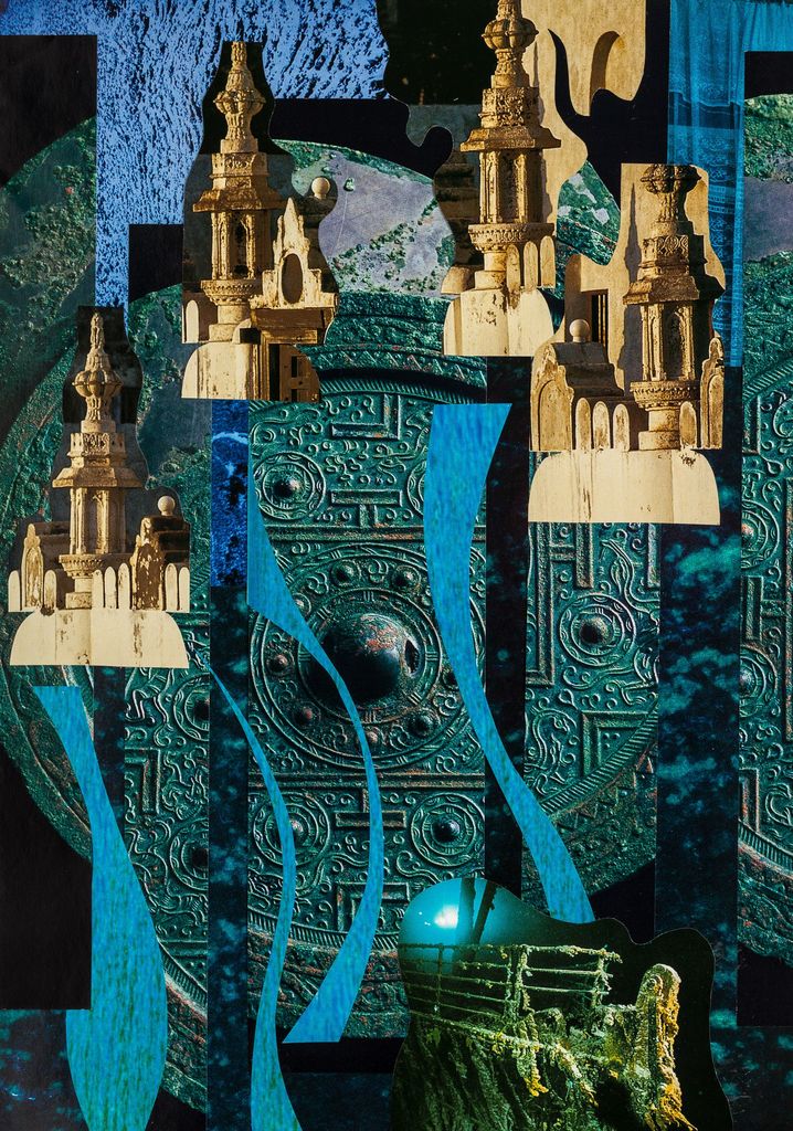 Collage van tijdschrift illustraties: samengesteld uit archeologische illustraties en diverse blauwe patronen. Fotoprint te koop via schaduwlichtje.werkaandemuur.nl; zie onder 'links'.