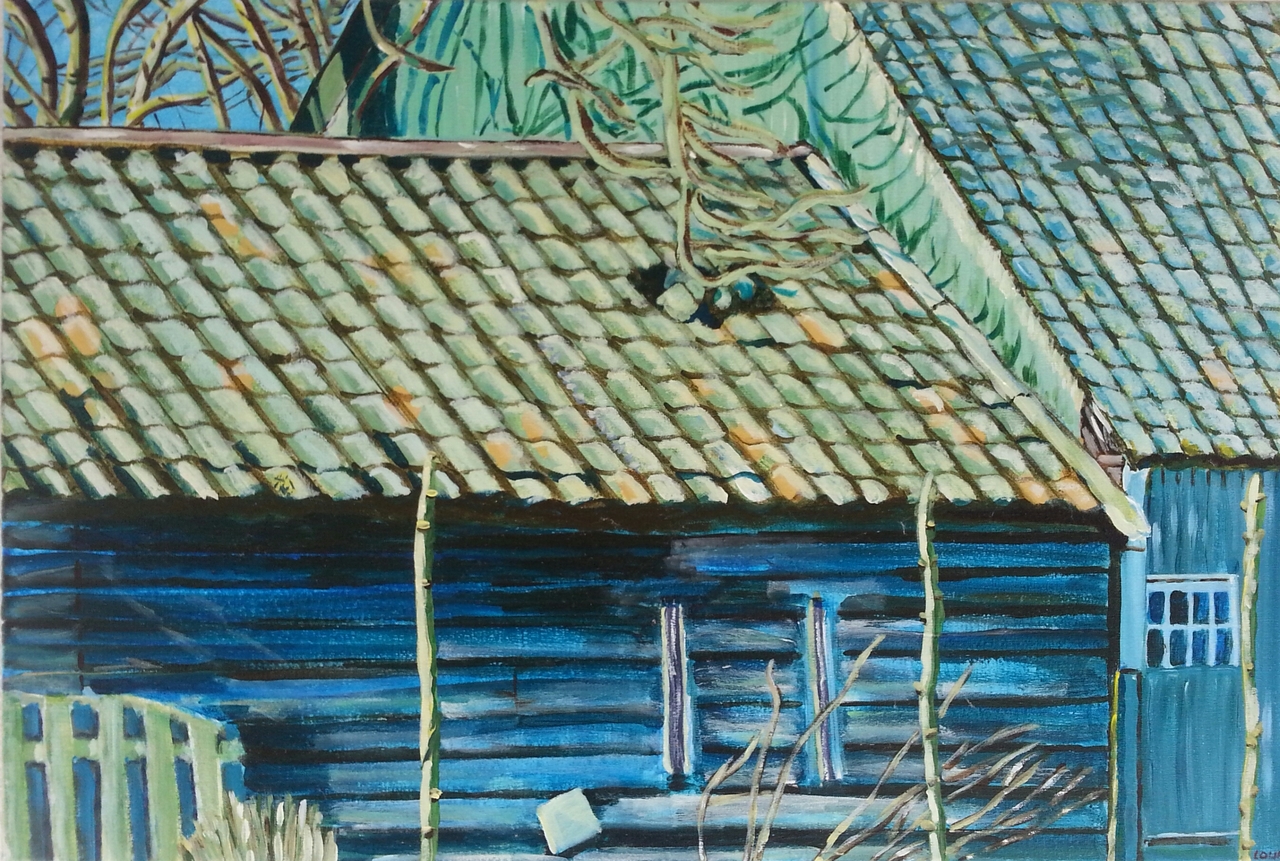 Schilderij Blauw Art Blue Tuin Kunst Painting Garden Schuur Barn Scheltema Louky Loukyscheltema