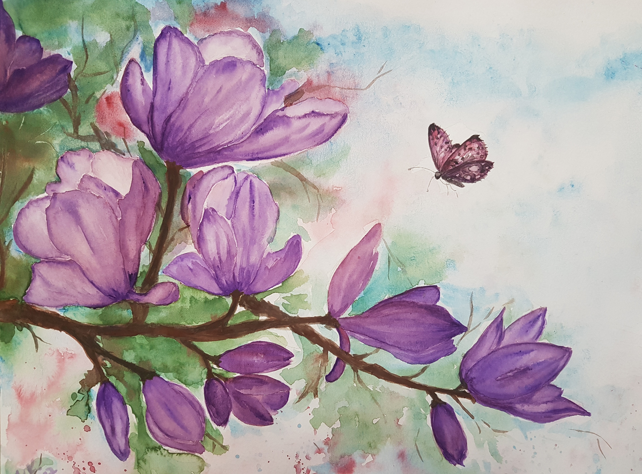 Paars Bloemen Vlinder Aquarel Natuur Roze Boom Plant Lente Voorjaar Magnolia