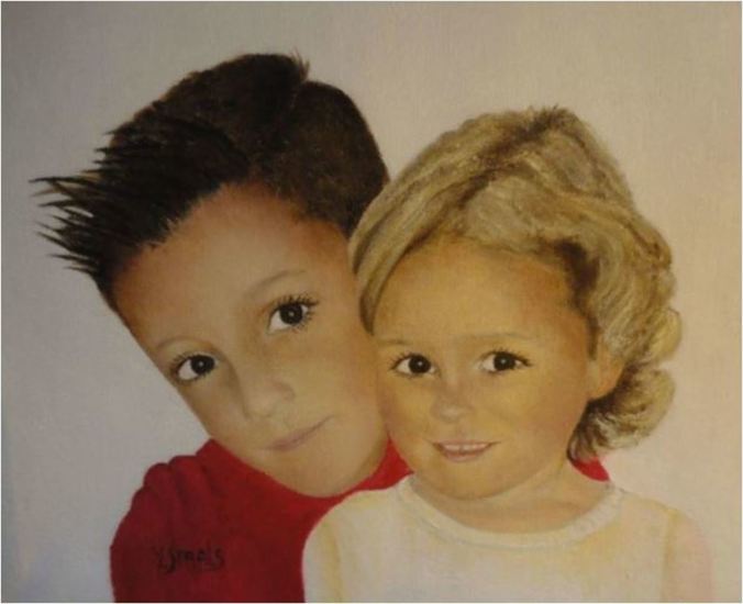 Schilderij Wit Meisje Portret Bruin Olieverf Roze Jongen Kinderen Kinderportret Ecru Neef Nicht