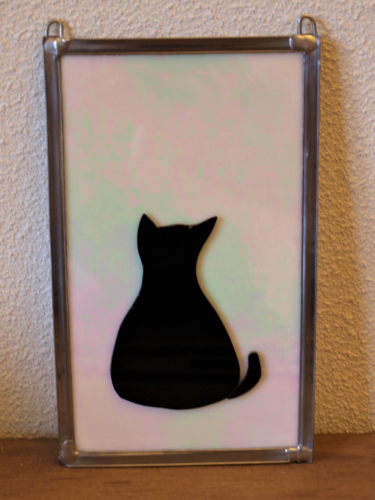 Gebaseerd op de ouderwetse 'schaduwportretjes'. Zwart opaalglas op wit iridiscerend opaalglas, met een loden lijstje v.v. ophanghaakjes.