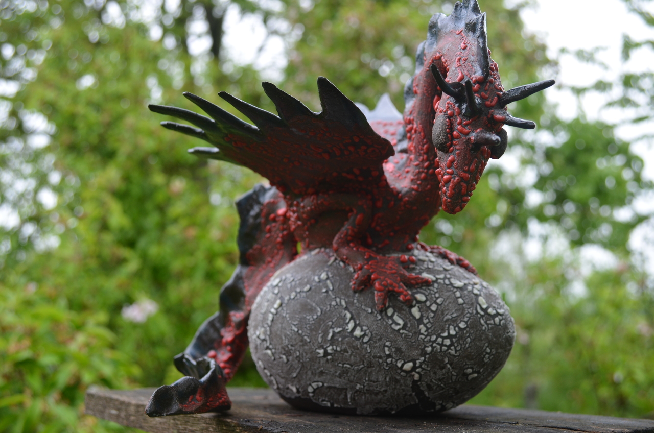 Rode draak is neergestreken op zijn ei. Hij bewaakt zijn ei met zijn grote lichaam. Zwart bakende klei, geglazuurd met rode terugtrekkende glazuur. De ei is geglazuurd met het witte terugtrekkende glazuur.