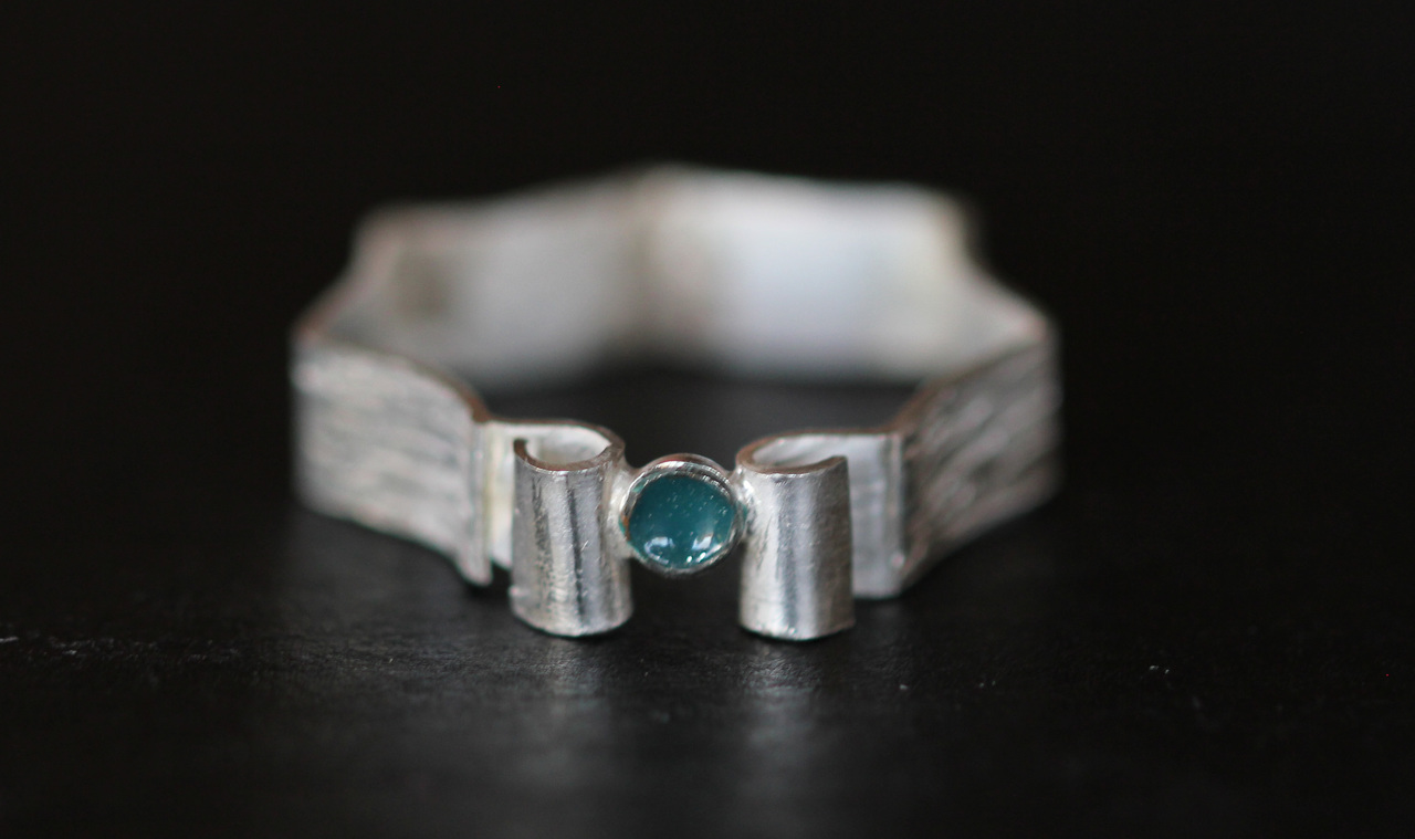 Zilveren schulpringetje, met rond kastje (blauwgroen)
