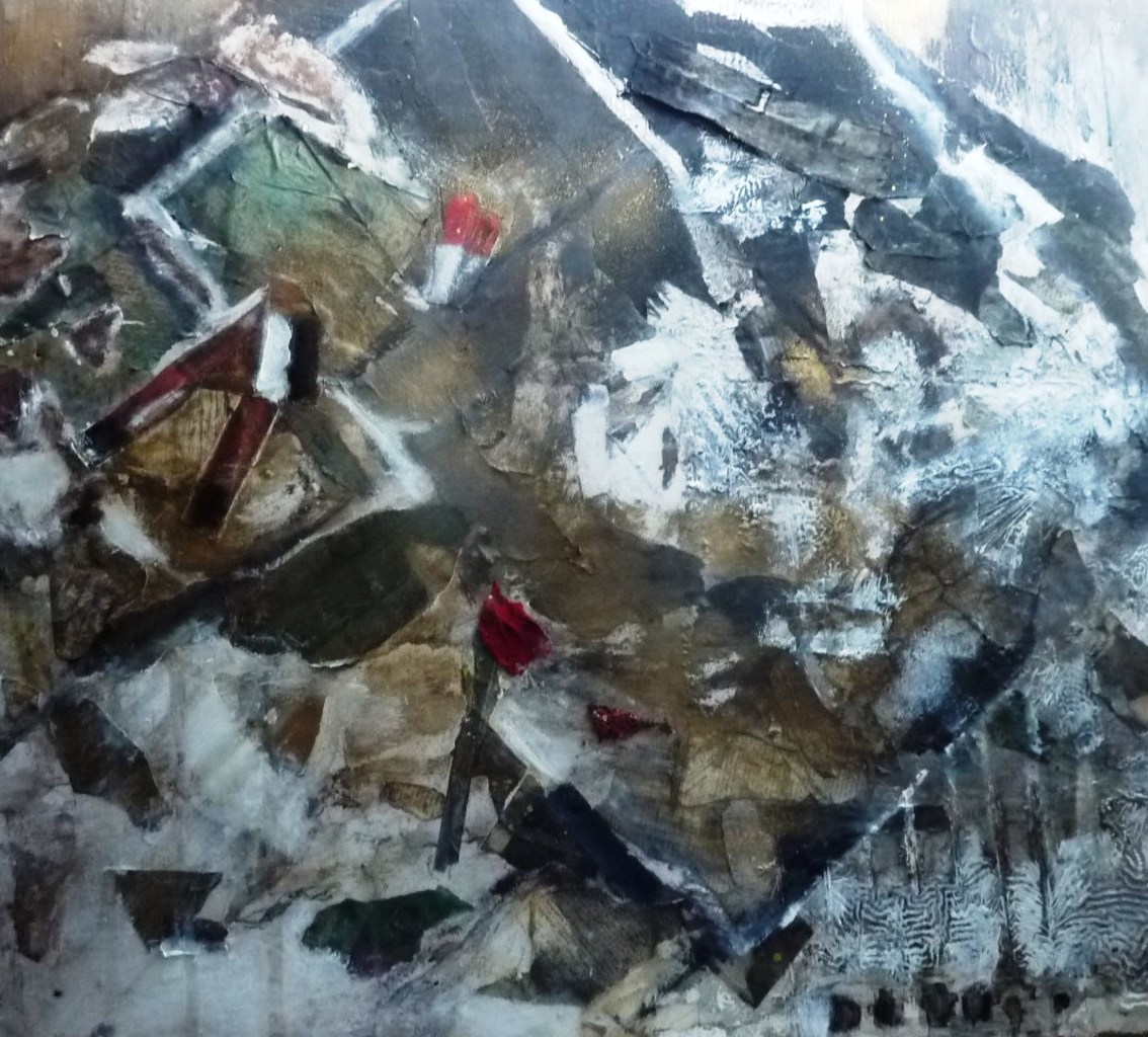 In de herst van 2016 maakte ik veel collages in rustige tinten. Deze heeft wat rood De klem geeft de verbinding aan.