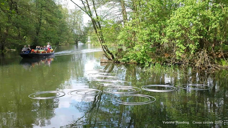 “Eigenlijk gebruik ik de huid van het water als een canvas” Het werk ligt zo vlak op het water, waardoor het lijkt of de ‘huid‘ van het water van textuur veranderd. Het lijkt het gevolg van een beroering, de beweging van het water, het uitdijen van de cirkelvorm van binnen naar buiten. Als een streling van de huid, een uiting van genegenheid en liefde. Deze installatie vormt een kruis. Symbool voor geloof. Geloof en hoop ligt voor mij dicht bij elkaar. Het werk ligt verankerd een symbool van hoop dat zich onder de oppervlakte afspeelt. De zilverkleurige uitstraling zal geleidelijk veranderen door algen en zich qua kleur steeds meer een geheel vormen met het water (gevoel). Maar de textuur blijft.