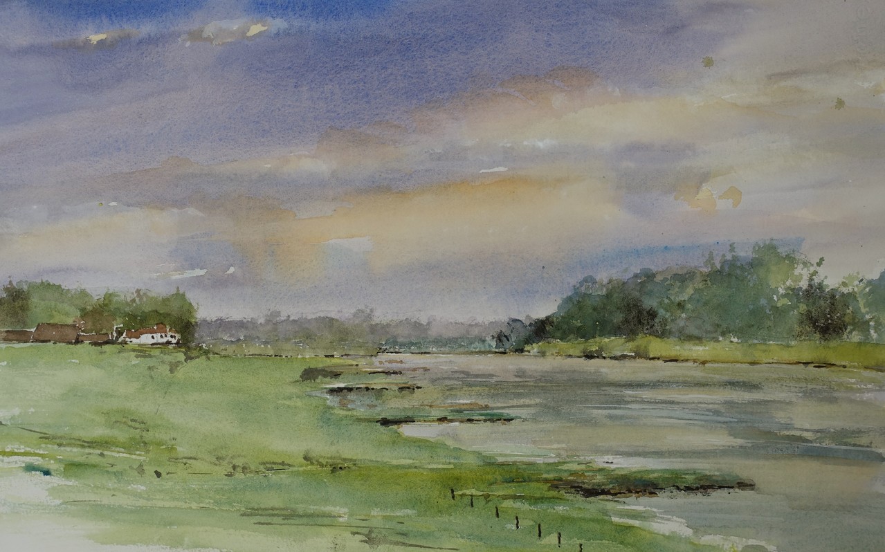 Giesbeek ligt op 8 km van Doesburg en de IJssel is daar, dank zij een dode arm, heel mooi. Deze aquarel was mijn eerste werkstuk van een weekendje Doesburg.