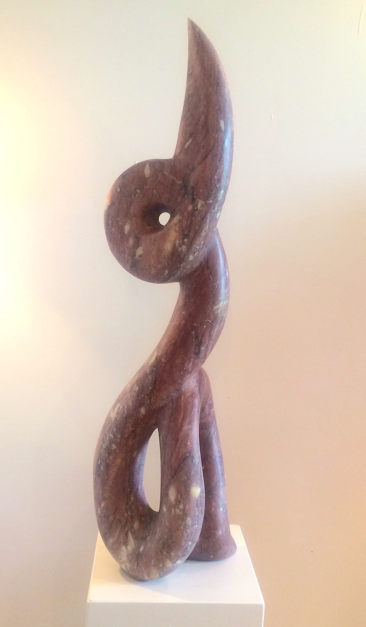 Abstract beeld van Grieks marmer (Parnon), in de kleur grijs-roze (met witte insluitsels). Het beeld is geplaatst op een zwarte, hardstenen sokkel.